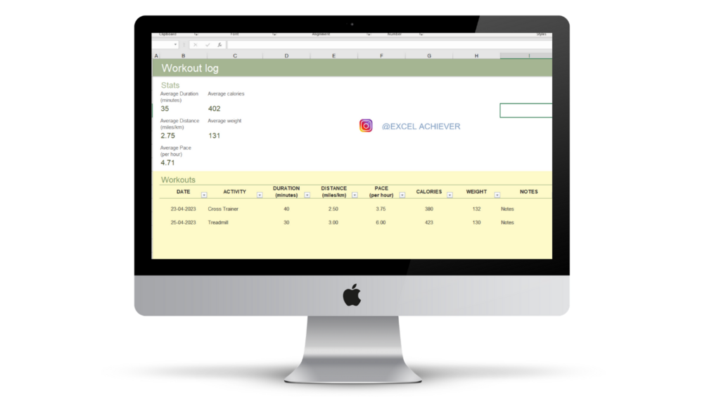 This easy-to-use template comes with pre-built formulas that automatically calculate and display key workout stats such as average weight and calories , average duration of exercise, average distance and speed.